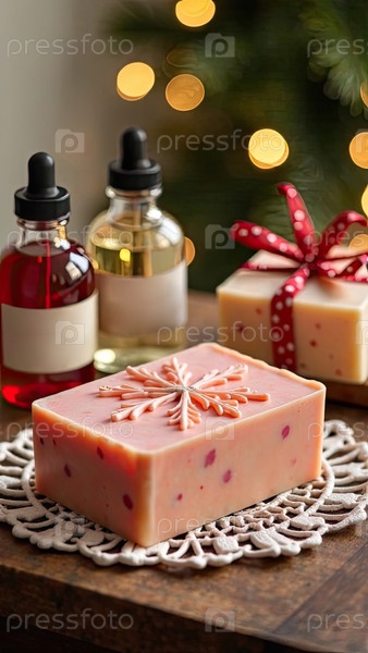 Ручно сделанное натуральное эко мыло на столе с бутылками с ароматизатором, красителем и основой для мыла на рождественском фоне. Подарок, подарок, ремесло на Новый год и Рождество. Производство любительского мыла, домашнее изготовление. ИИ генерируется;