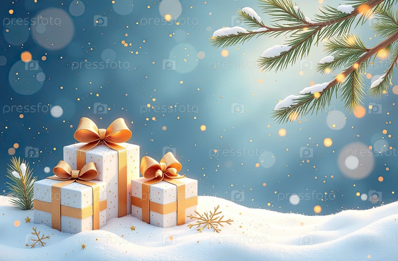 Рождественский голубой фон с белыми коробками для подарков со золотыми лучами, светящимся боке и блеском. Праздничное настроение Карточка на Рождество и Новый год с копировальным пространством. ИИ генерируется