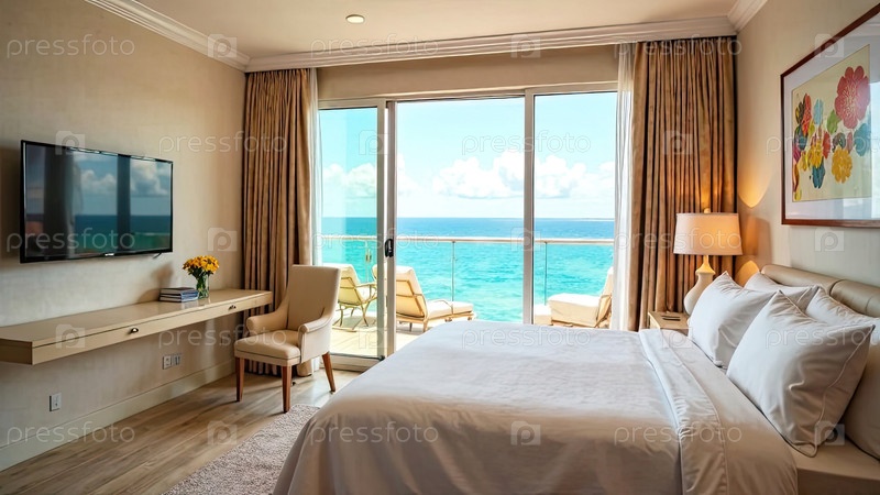 Интерьер гостиничного номера с видом на океан для пляжного отдыха и путешествий