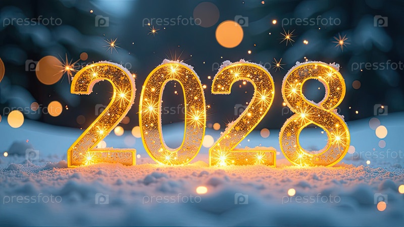 Прозрачные золотые светящиеся числа 2028 на снежном фоне Нового года с золотистыми гирляндами боке, секины, звезды, снег, блеск. Поздравления, открытка. Календарь, обложка. AI generated