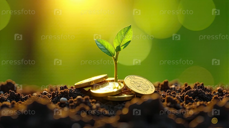 Молодой зеленый побег растет из земли и золотые монеты вблизи на зеленом фоне. Экономика, финансы, экология, стартап. ИИ генерируется
