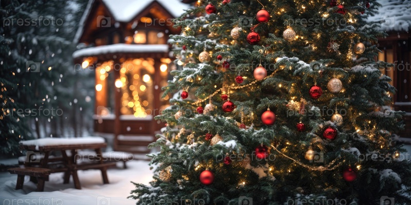 Фея Рождественская елка во дворе уютного дома на заднем плане светит теплыми фейриными огнями с золотыми и красными шарами декора, коробками с подарками.Рождество и Новый год, праздничное настроение, поздравительная открытка