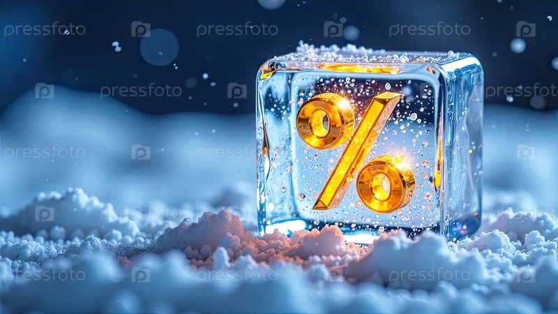 Неон светящийся золотой процентный знак в кубике льда на снежном фоне снаружи, блеск и снежинки Зимние распродажи и скидки, Черная пятница, Новый год, рождественский баннер, флаер. AI generated