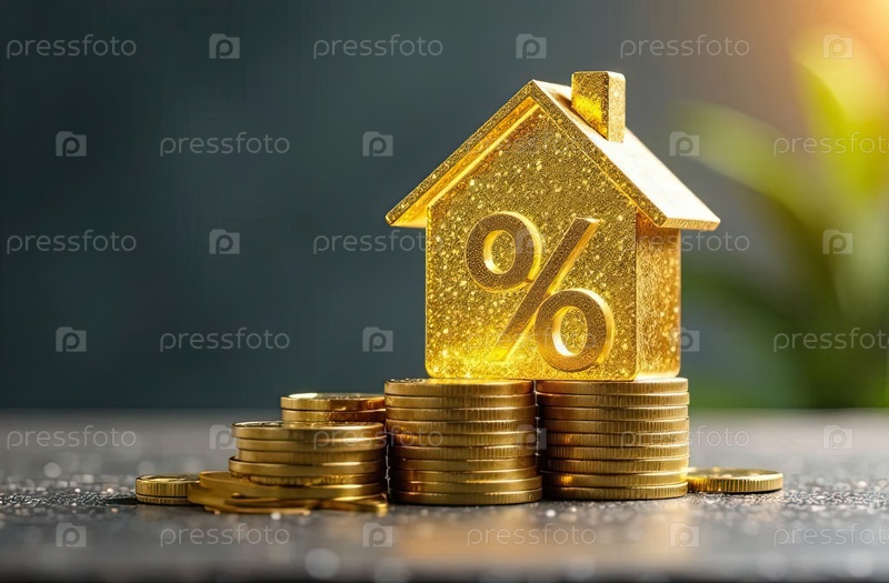 Золото светящийся символ процент в доме на стеке золотых монет на сером бетонном фоне. строительство жилья, скидка, купон, покупка, продажа, риэлторская деятельность, ипотека, страхование, бронирование. AI generated