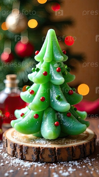 Ручная свеча в форме елки на рождественском фоне. Подарок, подарок, ремесло для Нового года и новогоднего подарка. Хоби-свечи и мыльное производство, домашнее изготовление. ИИ генерируется;