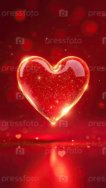 Красное стекло прозрачное светящееся сердце с блеском на красном фоне Святого Валентина. Романтический фон для Дня святого Валентина, любви, свидания. ИИ генерируется