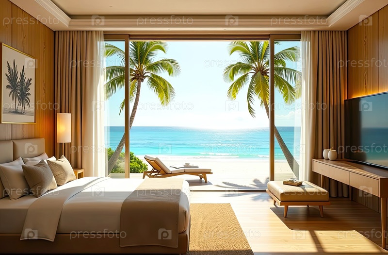 Интерьер гостиничного номера с видом на океан для пляжного отдыха и путешествий