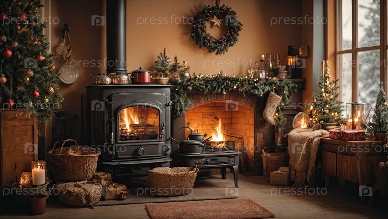 Уютная деревенская кухня с рождественским декором и чугунной печью камина, новогоднее настроение, подготовка к празднику, посуда. счастливого Рождества и Нового года поздравительную карточку, домашнее тепло. ИИ генерируется