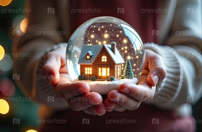 Магический стеклянный шар с крошечным современным домом и снегом внутри в уютной руке с рождественской елкой с гирляндами на фоне. страхование, ипотека, покупка недвижимости. ИИ генерируется