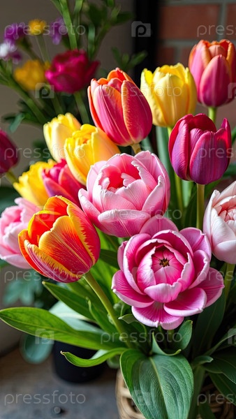 Красочные букеты тюльпанов в цветочном магазине - свежерезанные цветы на складе и стеллажи для продажи, доставка к празднику. весна, 8 марта, женский день, день рождения. ИИ генерируется