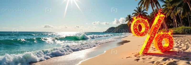 Огненный горящий знак процент на берегу моря с тропическими пальмами в свете солнца, фон заката океана. жаркая летняя распродажа и скидки, горящий тур-баннер, флаер. ИИ генерируется
