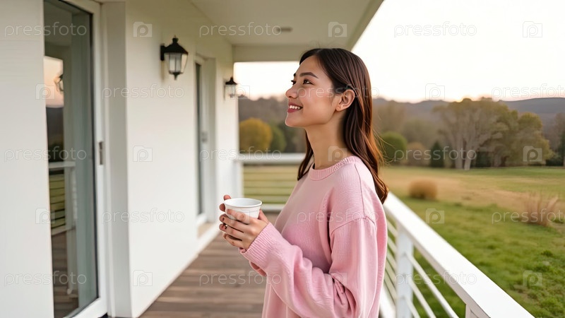 Азиатская женщина на крыльце дома, наслаждаясь кофе при восходе солнца, уютный розовый верх, весеннее сельское утро