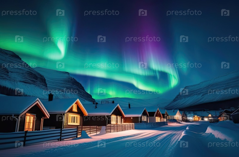 Северные огни в небе над северной деревней со снежными уютными домами зимой