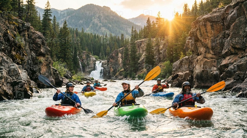 Плот с друзьями в диких горных порогах рек, командная работа и адреналин, приключения на открытом воздухе, путешествия по действию, групповая энергия