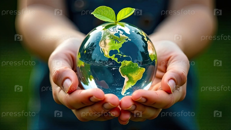 Светящаяся стеклянная сфера планеты Земля с зелеными растениями, растущими в руках детей, забота о планете, чистая окружающая среда, защита экологии, зеленая планета