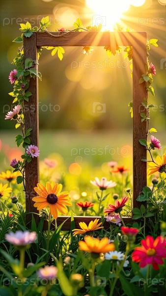 Летние дикие цветы обрамлены солнечными лучами с пространством для текста на фоне летнего поля