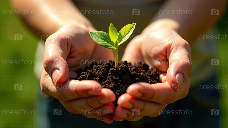 Молодой зеленый побег в горстке земли в ладонях фермера растений в земле на близком расстоянии
