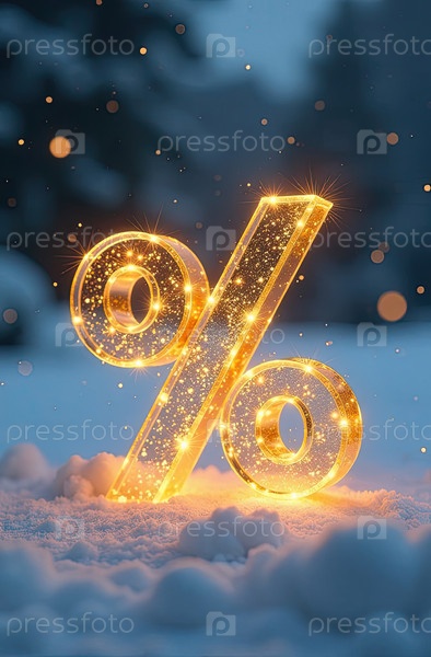 Неон светящийся золотой процентный знак на снежном фоне снаружи, блеск и снежинки. Зимняя распродажа и скидки, Черная пятница, Новый год, Рождество. баннер, флаер с копировальным пространством. ИИ генерируется