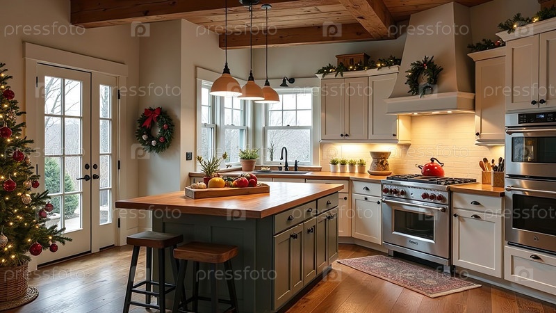 Верхний интерьер уютной современной рождественской кухни, новогоднее настроение, подготовка к празднику, посуда. Рождественский декор современной кухни, снег снаружи окна. ИИ генерируется