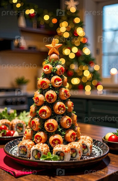 Аппетит быстрого питания в виде рождественской елки из рулонов, суши, красной рыбы на праздничном новогоднем столе. меню, рецепт и красивая презентация, доставка из ресторана. ИИ генерируется;
