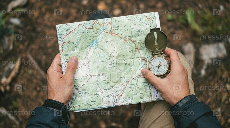 Руки, держащие карту и компас для навигации в горном пейзаже, планирования приключений, принятия решений о путешествии, исследования на открытом воздухе, подготовки