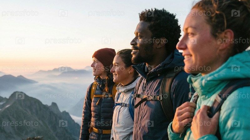 Группа друзей с рюкзаками на горных походах, единство и командная работа, путешествия приключений, поездки под открытым небом, счастливое исследование