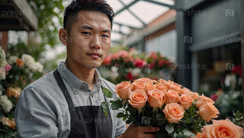 Азиатский цветочник-мужчина, стоящий за розовой розу и оранжевыми лилиями, организует букеты для свадеб, дней рождения и подарков середины осени в Китае и Корее