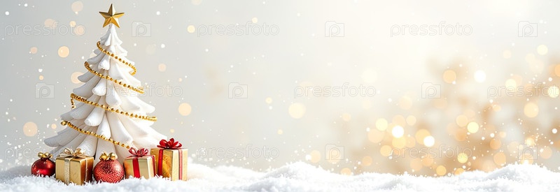 Акварельная белая и золотая рождественская елка и коробки для подарков на сияющем фоне. поздравительная карточка на Рождество и Новый год с копировальным пространством. созданный ИИ