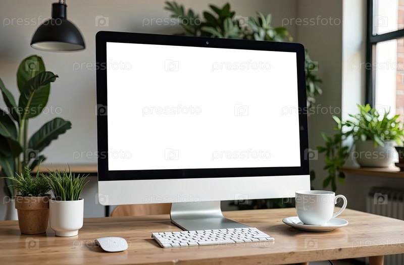 Монитор компьютера с белым экраном макет на столе в уютном домашнем офисе с горшковыми растениями, книжной полкой и белой чашечкой кофе