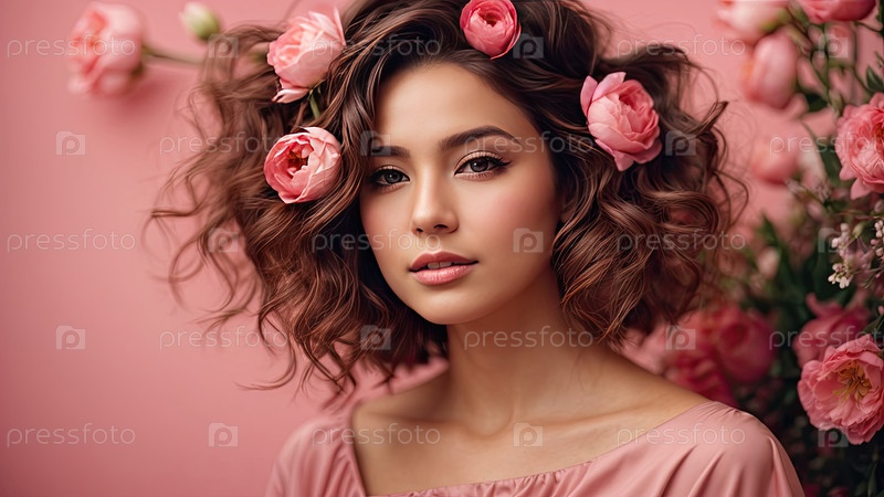 Улыбающаяся молодая женщина с кудрявыми волосами и розовой цветочной лентой на голове, весеннее вдохновение, женская красота, День женщины