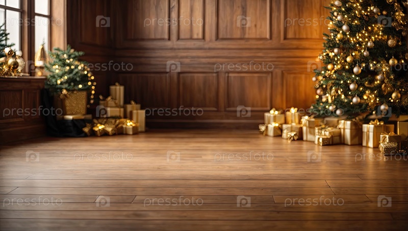 Пустой деревянный пол в коричневых и золотых тонах для отображения продукции со стеной во внутренней части комнаты, с рождественским декором. Копирование пространства, Рождество и Новый год. ИИ генерируется