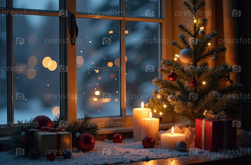 Внутреннее уютное окно с рождественским декором и теплыми световыми гирляндами и свечами - внутренний вид зимой и снегом со спасом для текста. Отпразднуйте Рождество и Новый год, елку, боке. ИИ генерируется