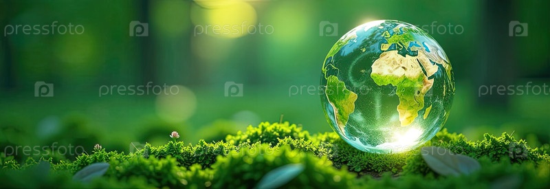 Стеклянная светящаяся сфера планеты Земля в лесу - это шар с внутренним микроклиматом, чистой окружающей средой, защищающий экологию планеты