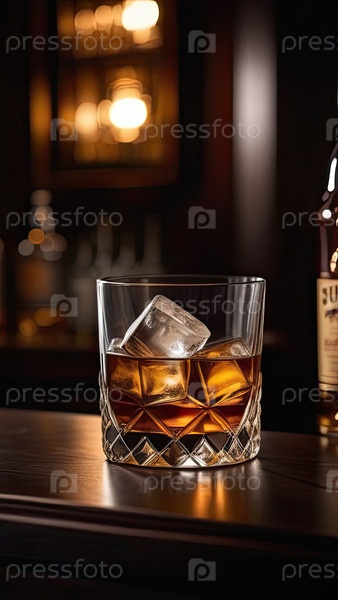 Виски с камнями, темная стильная обстановка в баре, высококлассный алкоголь, элегантное стекло, пространство для копирования продуктов