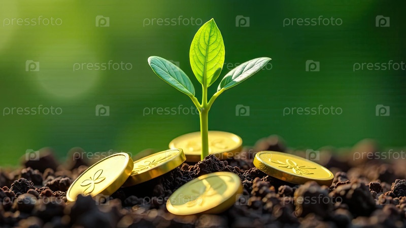 Молодой зеленый побег растет из земли и золотые монеты вблизи на зеленом фоне. Экономика, финансы, экология, стартап. ИИ генерируется