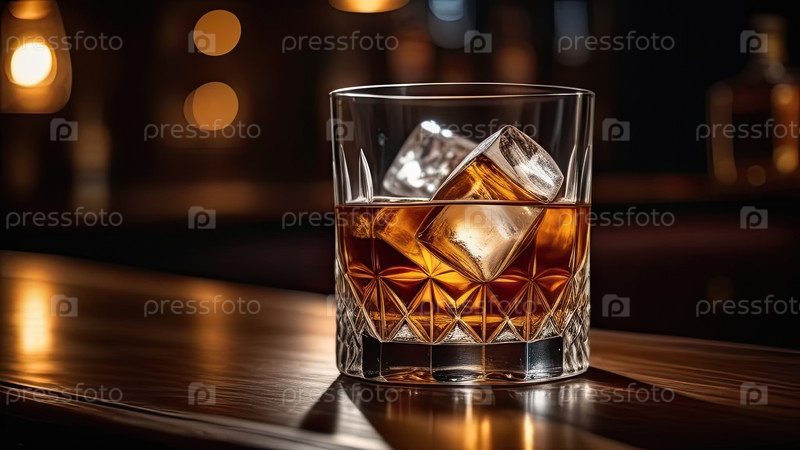Ночной бар, виски с льдом, настроение яркий свет, изысканный шаблон алкоголя для рекламных акций, пространство копирования