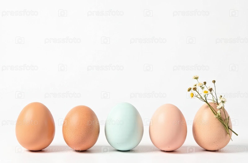 Внизу изображения пять яиц со свободным пространством сверху изображения для текста, с применением естественных весенних цветов на пастельных цветах яйца, белый фон. Пасхальный баннер с пробелом для текста. ИИ генерируется