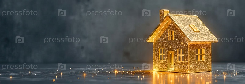 Прозрачное золото светящийся символ дома на сером бетонном фоне с золотым блеском. недвижимость, риэлтор, ипотека, страхование, бронирование, строительство, изоляция, отопление. ИИ генерируется