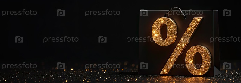 Неон светящийся золотой процентный знак на черном фоне. витрина магазина для Черной пятницы, распродажи, скидки, сумки для покупок. баннер, флаер. AI generated