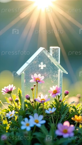 Крошечный экологический дом теплица в солнечных лучах, с весенними пастельными цветами на весеннем пастельно-синем фоне. недвижимость, риэлтор, ипотека, страхование, бронирование, строительство, изоляция. ИИ генерируется