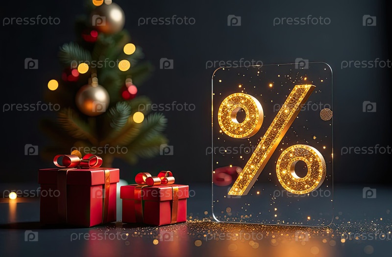 Неон светящийся золотой процентный знак на рождественском фоне с елкой, блесками и коробками для подарков. витрина магазина в Черную пятницу, Новый год, Рождественская распродажа, скидки. баннер, флаер. ИИ генерируется