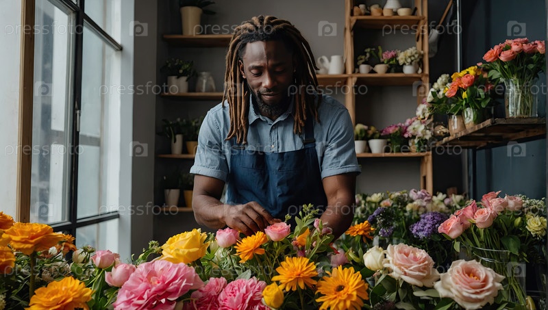 Чернокожий цветочник с дредоками и очками собирает букет розовых пионьев и тюльпанов для весеннего мероприятия
