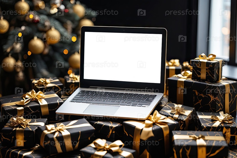 Ноутбук с белым экраном макет на столе в офисе рождественского декора с подарочными коробками для сотрудников, магазины, корпоративные подарки, Черная пятница,