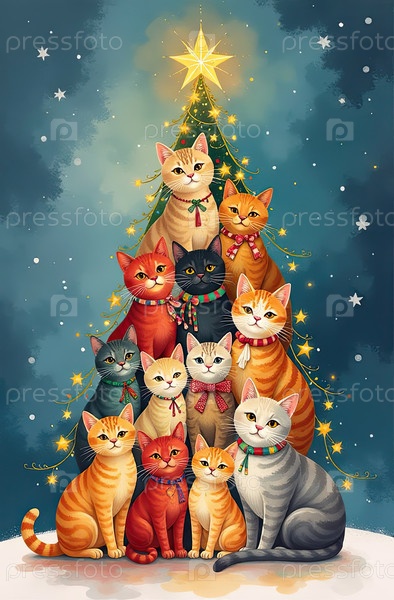 Акварельная рождественская елка из кошек, сделанная на праздничном фоне с блеском, многоцветные сотни кошек складываются в форме высокой рождественской елки с золотыми светящимися гирляндными огнями