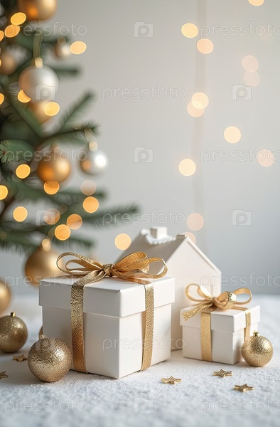 Золото-белый символический дом и подарочная коробка под рождественской елкой на столе Рождественский фон с золотым блестком на поздравительной карточке