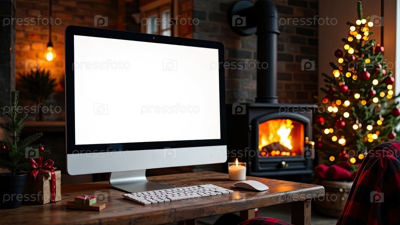 Монитор домашнего компьютера с белым экраном макет на столе в уютном домашнем офисе рождественского декора, елки и горящего камина с гирляндами