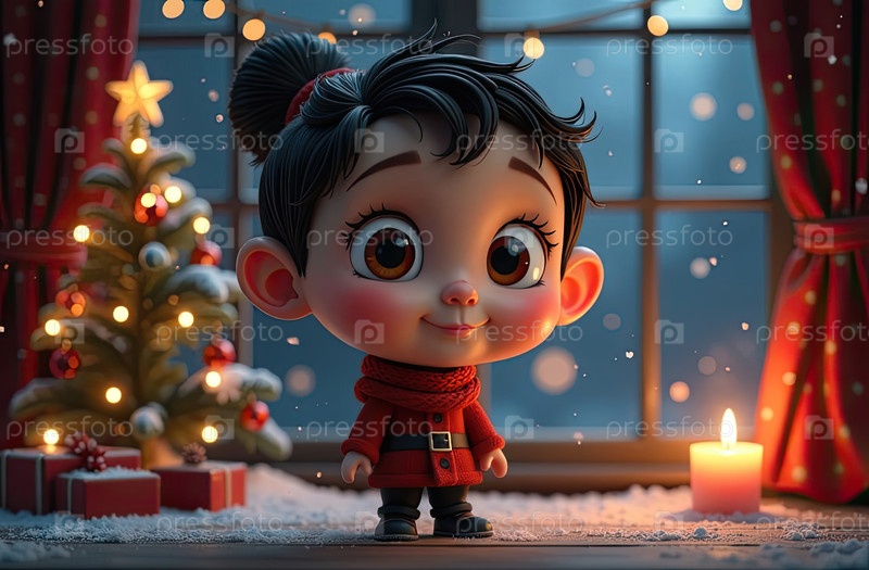 Сказочный детский персонаж из мультфильмов - это девушка в уютном окне с рождественским декором и теплыми световыми гирляндами и свечами. отпразднуйте Рождество и Новый год на открытке со спасом для текста. созданный ИИ