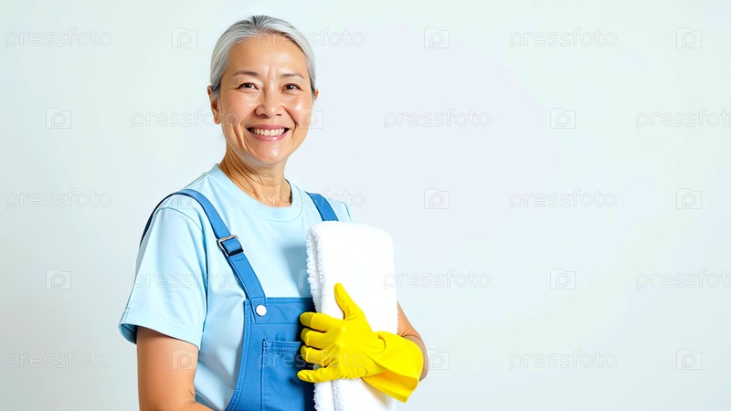 Портрет взрослой азиатской женщины в синем фартуке и желтых резиновых перчатках с тряпкой в руке возле белой стены со свободным местом для текста, услуги очистки окон, уборки дома, горничной