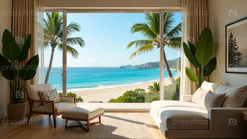 Интерьер гостиничного номера с видом на океан для пляжного отдыха и путешествий