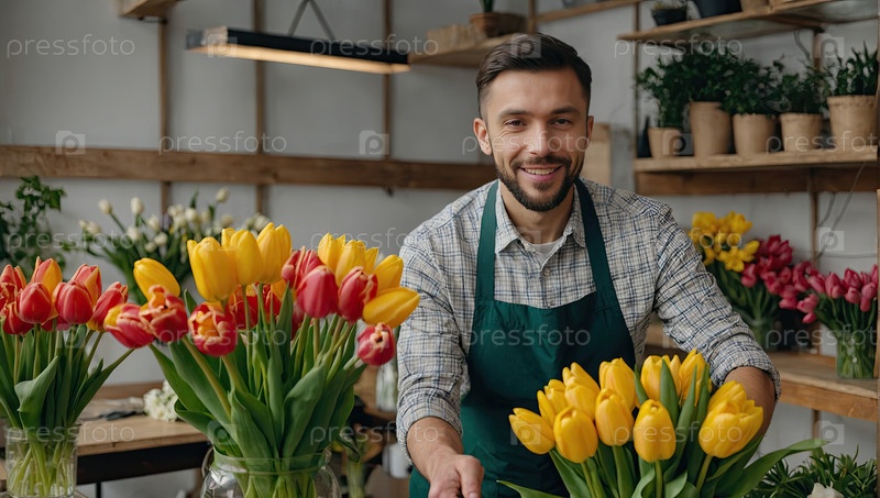Европейский цветочник с бородой, держащий желтый букет тюльпанов для весенней романтической доставки и специального заказа подарков